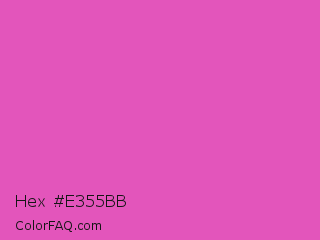 Hex #e355bb Color is a light magenta color and the nearest color is Brilliant Rose #f653a6. Hex code #e355bb and RGB value is rgb(227,85,187). In RGB color space, this color is composed of 89% red, 33% green, 73% blue, In CMYK color space, this color is composed of 0% cyan, 63% magenta, 18% yellow , 11% black , In HSL color space, this color has a hue angle of 317° , 72% saturation and 61% lightness.