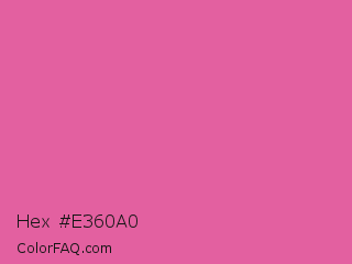 Hex #e360a0 Color is a light rose color and the nearest color is Thulian Pink #de6fa1. Hex code #e360a0 and RGB value is rgb(227,96,160). In RGB color space, this color is composed of 89% red, 38% green, 63% blue, In CMYK color space, this color is composed of 0% cyan, 58% magenta, 30% yellow , 11% black , In HSL color space, this color has a hue angle of 331° , 70% saturation and 63% lightness.