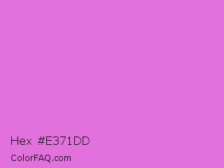 Hex #e371dd Color is a light magenta color and the nearest color is Orchid #da70d6. Hex code #e371dd and RGB value is rgb(227,113,221). In RGB color space, this color is composed of 89% red, 44% green, 87% blue, In CMYK color space, this color is composed of 0% cyan, 50% magenta, 3% yellow , 11% black , In HSL color space, this color has a hue angle of 303° , 67% saturation and 67% lightness.