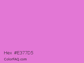 Hex #e377d5 Color is a light magenta color and the nearest color is Orchid #da70d6. Hex code #e377d5 and RGB value is rgb(227,119,213). In RGB color space, this color is composed of 89% red, 47% green, 84% blue, In CMYK color space, this color is composed of 0% cyan, 48% magenta, 6% yellow , 11% black , In HSL color space, this color has a hue angle of 308° , 66% saturation and 68% lightness.