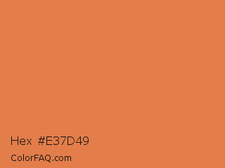 Hex #e37d49 Color is a normal orange color and the nearest color is Burnt Sienna #e97451. Hex code #e37d49 and RGB value is rgb(227,125,73). In RGB color space, this color is composed of 89% red, 49% green, 29% blue, In CMYK color space, this color is composed of 0% cyan, 45% magenta, 68% yellow , 11% black , In HSL color space, this color has a hue angle of 20° , 73% saturation and 59% lightness.