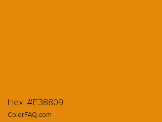 Hex #e38809 Color is a normal orange color and the nearest color is Fulvous #e48400. Hex code #e38809 and RGB value is rgb(227,136,9). In RGB color space, this color is composed of 89% red, 53% green, 4% blue, In CMYK color space, this color is composed of 0% cyan, 40% magenta, 96% yellow , 11% black , In HSL color space, this color has a hue angle of 35° , 92% saturation and 46% lightness.