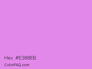 Hex #e388eb Color is a light magenta color and the nearest color is Lavender Magenta #ee82ee. Hex code #e388eb and RGB value is rgb(227,136,235). In RGB color space, this color is composed of 89% red, 53% green, 92% blue, In CMYK color space, this color is composed of 3% cyan, 42% magenta, 0% yellow , 8% black , In HSL color space, this color has a hue angle of 295° , 71% saturation and 73% lightness.