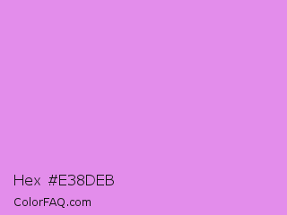 Hex #e38deb Color is a light magenta color and the nearest color is Bright Lilac #d891ef. Hex code #e38deb and RGB value is rgb(227,141,235). In RGB color space, this color is composed of 89% red, 55% green, 92% blue, In CMYK color space, this color is composed of 3% cyan, 40% magenta, 0% yellow , 8% black , In HSL color space, this color has a hue angle of 295° , 70% saturation and 74% lightness.