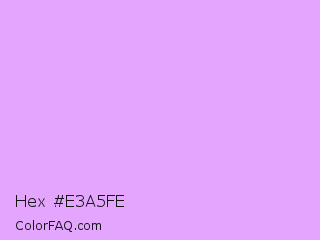 Hex #e3a5fe Color is a very light purple color and the nearest color is Mauve #e0b0ff. Hex code #e3a5fe and RGB value is rgb(227,165,254). In RGB color space, this color is composed of 89% red, 65% green, 100% blue, In CMYK color space, this color is composed of 11% cyan, 35% magenta, 0% yellow , 0% black , In HSL color space, this color has a hue angle of 282° , 98% saturation and 82% lightness.