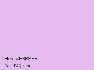 Hex #e3bbee Color is a very light purple color and the nearest color is French Lilac #ecc7ee. Hex code #e3bbee and RGB value is rgb(227,187,238). In RGB color space, this color is composed of 89% red, 73% green, 93% blue, In CMYK color space, this color is composed of 5% cyan, 21% magenta, 0% yellow , 7% black , In HSL color space, this color has a hue angle of 287° , 60% saturation and 83% lightness.