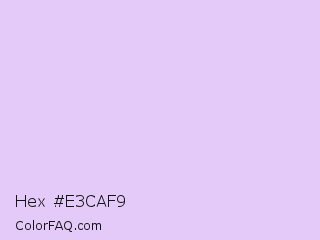 Hex #e3caf9 Color is a very light purple color and the nearest color is Pale Lavender #dcd0ff. Hex code #e3caf9 and RGB value is rgb(227,202,249). In RGB color space, this color is composed of 89% red, 79% green, 98% blue, In CMYK color space, this color is composed of 9% cyan, 19% magenta, 0% yellow , 2% black , In HSL color space, this color has a hue angle of 272° , 80% saturation and 88% lightness.