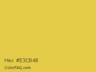 Hex #e3cb48 Color is a normal yellow color and the nearest color is Ronchi #ecc54e. Hex code #e3cb48 and RGB value is rgb(227,203,72). In RGB color space, this color is composed of 89% red, 80% green, 28% blue, In CMYK color space, this color is composed of 0% cyan, 11% magenta, 68% yellow , 11% black , In HSL color space, this color has a hue angle of 51° , 73% saturation and 59% lightness.
