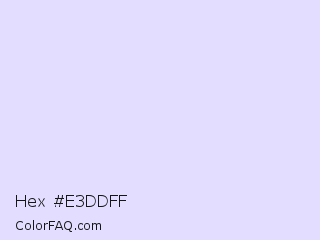 Hex #e3ddff Color is a very light indigo color and the nearest color is Lavender Mist #e6e6fa. Hex code #e3ddff and RGB value is rgb(227,221,255). In RGB color space, this color is composed of 89% red, 87% green, 100% blue, In CMYK color space, this color is composed of 11% cyan, 13% magenta, 0% yellow , 0% black , In HSL color space, this color has a hue angle of 251° , 100% saturation and 93% lightness.