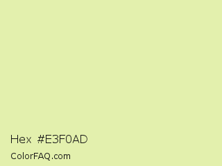 Hex #e3f0ad Color is a very light lime color and the nearest color is Caper #dcedb4. Hex code #e3f0ad and RGB value is rgb(227,240,173). In RGB color space, this color is composed of 89% red, 94% green, 68% blue, In CMYK color space, this color is composed of 5% cyan, 0% magenta, 28% yellow , 6% black , In HSL color space, this color has a hue angle of 72° , 69% saturation and 81% lightness.