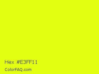 Hex #e3ff11 Color is a normal yellow color and the nearest color is Lemon Lime #e3ff00. Hex code #e3ff11 and RGB value is rgb(227,255,17). In RGB color space, this color is composed of 89% red, 100% green, 7% blue, In CMYK color space, this color is composed of 11% cyan, 0% magenta, 93% yellow , 0% black , In HSL color space, this color has a hue angle of 67° , 100% saturation and 53% lightness.