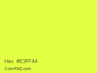Hex #e3ff44 Color is a light yellow color and the nearest color is Starship #ecf245. Hex code #e3ff44 and RGB value is rgb(227,255,68). In RGB color space, this color is composed of 89% red, 100% green, 27% blue, In CMYK color space, this color is composed of 11% cyan, 0% magenta, 73% yellow , 0% black , In HSL color space, this color has a hue angle of 69° , 100% saturation and 63% lightness.