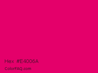 Hex #e4006a Color is a normal rose color and the nearest color is Red Purple #e40078. Hex code #e4006a and RGB value is rgb(228,0,106). In RGB color space, this color is composed of 89% red, 0% green, 42% blue, In CMYK color space, this color is composed of 0% cyan, 100% magenta, 54% yellow , 11% black , In HSL color space, this color has a hue angle of 332° , 100% saturation and 45% lightness.