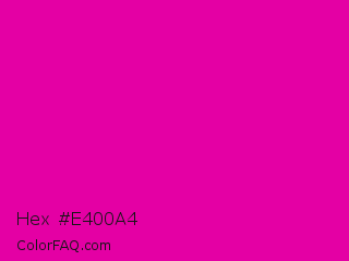 Hex #e400a4 Color is a normal magenta color and the nearest color is Hollywood Cerise #f400a1. Hex code #e400a4 and RGB value is rgb(228,0,164). In RGB color space, this color is composed of 89% red, 0% green, 64% blue, In CMYK color space, this color is composed of 0% cyan, 100% magenta, 28% yellow , 11% black , In HSL color space, this color has a hue angle of 317° , 100% saturation and 45% lightness.