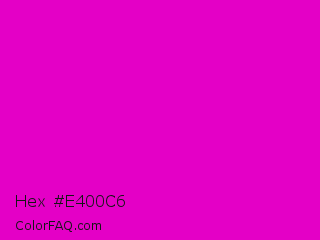 Hex #e400c6 Color is a normal magenta color and the nearest color is Deep Magenta #cc00cc. Hex code #e400c6 and RGB value is rgb(228,0,198). In RGB color space, this color is composed of 89% red, 0% green, 78% blue, In CMYK color space, this color is composed of 0% cyan, 100% magenta, 13% yellow , 11% black , In HSL color space, this color has a hue angle of 308° , 100% saturation and 45% lightness.