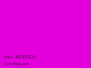 Hex #e400dc Color is a normal magenta color and the nearest color is Deep Magenta #cc00cc. Hex code #e400dc and RGB value is rgb(228,0,220). In RGB color space, this color is composed of 89% red, 0% green, 86% blue, In CMYK color space, this color is composed of 0% cyan, 100% magenta, 4% yellow , 11% black , In HSL color space, this color has a hue angle of 302° , 100% saturation and 45% lightness.
