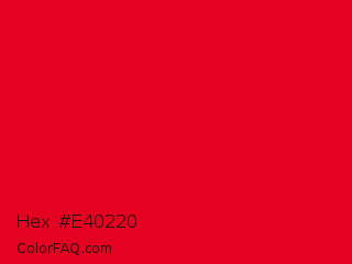 Hex #e40220 Color is a normal red color and the nearest color is Cadmium Red #e30022. Hex code #e40220 and RGB value is rgb(228,2,32). In RGB color space, this color is composed of 89% red, 1% green, 13% blue, In CMYK color space, this color is composed of 0% cyan, 99% magenta, 86% yellow , 11% black , In HSL color space, this color has a hue angle of 352° , 98% saturation and 45% lightness.
