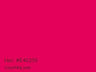 Hex #e40259 Color is a normal rose color and the nearest color is Razzmatazz Crayola #e30b5c. Hex code #e40259 and RGB value is rgb(228,2,89). In RGB color space, this color is composed of 89% red, 1% green, 35% blue, In CMYK color space, this color is composed of 0% cyan, 99% magenta, 61% yellow , 11% black , In HSL color space, this color has a hue angle of 337° , 98% saturation and 45% lightness.