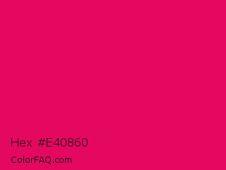 Hex #e40860 Color is a normal rose color and the nearest color is Raspberry #e30b5d. Hex code #e40860 and RGB value is rgb(228,8,96). In RGB color space, this color is composed of 89% red, 3% green, 38% blue, In CMYK color space, this color is composed of 0% cyan, 96% magenta, 58% yellow , 11% black , In HSL color space, this color has a hue angle of 336° , 93% saturation and 46% lightness.