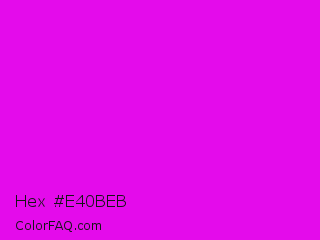Hex #e40beb Color is a normal magenta color and the nearest color is Phlox #df00ff. Hex code #e40beb and RGB value is rgb(228,11,235). In RGB color space, this color is composed of 89% red, 4% green, 92% blue, In CMYK color space, this color is composed of 3% cyan, 95% magenta, 0% yellow , 8% black , In HSL color space, this color has a hue angle of 298° , 91% saturation and 48% lightness.