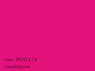 Hex #e4117a Color is a normal rose color and the nearest color is Vivid Cerise #da1d81. Hex code #e4117a and RGB value is rgb(228,17,122). In RGB color space, this color is composed of 89% red, 7% green, 48% blue, In CMYK color space, this color is composed of 0% cyan, 93% magenta, 46% yellow , 11% black , In HSL color space, this color has a hue angle of 330° , 86% saturation and 48% lightness.