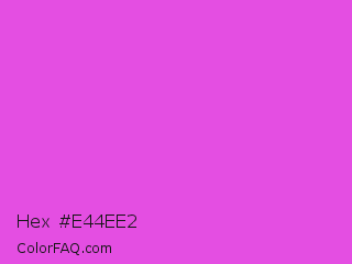 Hex #e44ee2 Color is a normal magenta color and the nearest color is Purple Pizzazz #fe4eda. Hex code #e44ee2 and RGB value is rgb(228,78,226). In RGB color space, this color is composed of 89% red, 31% green, 89% blue, In CMYK color space, this color is composed of 0% cyan, 66% magenta, 1% yellow , 11% black , In HSL color space, this color has a hue angle of 301° , 74% saturation and 60% lightness.