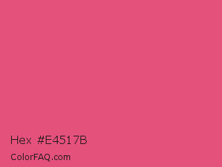 Hex #e4517b Color is a light rose color and the nearest color is Dark Pink #e75480. Hex code #e4517b and RGB value is rgb(228,81,123). In RGB color space, this color is composed of 89% red, 32% green, 48% blue, In CMYK color space, this color is composed of 0% cyan, 64% magenta, 46% yellow , 11% black , In HSL color space, this color has a hue angle of 343° , 73% saturation and 61% lightness.