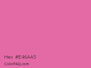 Hex #e46aa5 Color is a light rose color and the nearest color is Thulian Pink #de6fa1. Hex code #e46aa5 and RGB value is rgb(228,106,165). In RGB color space, this color is composed of 89% red, 42% green, 65% blue, In CMYK color space, this color is composed of 0% cyan, 54% magenta, 28% yellow , 11% black , In HSL color space, this color has a hue angle of 331° , 69% saturation and 65% lightness.