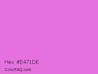 Hex #e471de Color is a light magenta color and the nearest color is Orchid #da70d6. Hex code #e471de and RGB value is rgb(228,113,222). In RGB color space, this color is composed of 89% red, 44% green, 87% blue, In CMYK color space, this color is composed of 0% cyan, 50% magenta, 3% yellow , 11% black , In HSL color space, this color has a hue angle of 303° , 68% saturation and 67% lightness.