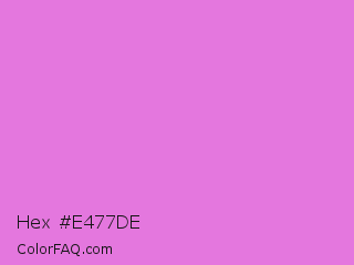Hex #e477de Color is a light magenta color and the nearest color is Orchid #da70d6. Hex code #e477de and RGB value is rgb(228,119,222). In RGB color space, this color is composed of 89% red, 47% green, 87% blue, In CMYK color space, this color is composed of 0% cyan, 48% magenta, 3% yellow , 11% black , In HSL color space, this color has a hue angle of 303° , 67% saturation and 68% lightness.