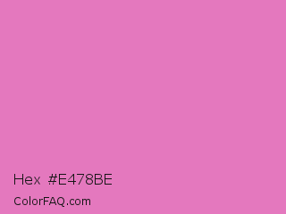 Hex #e478be Color is a light magenta color and the nearest color is Middle Purple #d982b5. Hex code #e478be and RGB value is rgb(228,120,190). In RGB color space, this color is composed of 89% red, 47% green, 75% blue, In CMYK color space, this color is composed of 0% cyan, 47% magenta, 17% yellow , 11% black , In HSL color space, this color has a hue angle of 321° , 67% saturation and 68% lightness.