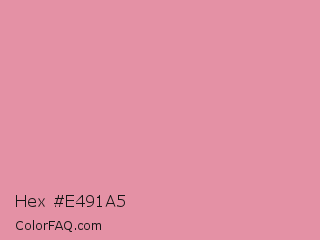 Hex #e491a5 Color is a light red color and the nearest color is Light Thulian Pink #e68fac. Hex code #e491a5 and RGB value is rgb(228,145,165). In RGB color space, this color is composed of 89% red, 57% green, 65% blue, In CMYK color space, this color is composed of 0% cyan, 36% magenta, 28% yellow , 11% black , In HSL color space, this color has a hue angle of 346° , 61% saturation and 73% lightness.
