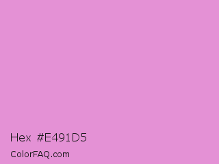 Hex #e491d5 Color is a light magenta color and the nearest color is Light Orchid #e29cd2. Hex code #e491d5 and RGB value is rgb(228,145,213). In RGB color space, this color is composed of 89% red, 57% green, 84% blue, In CMYK color space, this color is composed of 0% cyan, 36% magenta, 7% yellow , 11% black , In HSL color space, this color has a hue angle of 311° , 61% saturation and 73% lightness.