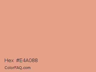 Hex #e4a088 Color is a light orange color and the nearest color is Tonys Pink #e79f8c. Hex code #e4a088 and RGB value is rgb(228,160,136). In RGB color space, this color is composed of 89% red, 63% green, 53% blue, In CMYK color space, this color is composed of 0% cyan, 30% magenta, 40% yellow , 11% black , In HSL color space, this color has a hue angle of 16° , 63% saturation and 71% lightness.