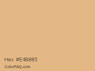 Hex #e4b885 Color is a light orange color and the nearest color is Burlywood #deb887. Hex code #e4b885 and RGB value is rgb(228,184,133). In RGB color space, this color is composed of 89% red, 72% green, 52% blue, In CMYK color space, this color is composed of 0% cyan, 19% magenta, 42% yellow , 11% black , In HSL color space, this color has a hue angle of 32° , 64% saturation and 71% lightness.