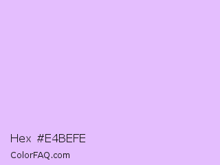 Hex #e4befe Color is a very light purple color and the nearest color is Mauve #e0b0ff. Hex code #e4befe and RGB value is rgb(228,190,254). In RGB color space, this color is composed of 89% red, 75% green, 100% blue, In CMYK color space, this color is composed of 10% cyan, 25% magenta, 0% yellow , 0% black , In HSL color space, this color has a hue angle of 276° , 97% saturation and 87% lightness.