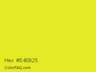 Hex #e4eb25 Color is a normal yellow color and the nearest color is Dandelion #f0e130. Hex code #e4eb25 and RGB value is rgb(228,235,37). In RGB color space, this color is composed of 89% red, 92% green, 15% blue, In CMYK color space, this color is composed of 3% cyan, 0% magenta, 84% yellow , 8% black , In HSL color space, this color has a hue angle of 62° , 83% saturation and 53% lightness.