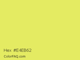 Hex #e4eb62 Color is a light yellow color and the nearest color is Booger Buster #dde26a. Hex code #e4eb62 and RGB value is rgb(228,235,98). In RGB color space, this color is composed of 89% red, 92% green, 38% blue, In CMYK color space, this color is composed of 3% cyan, 0% magenta, 58% yellow , 8% black , In HSL color space, this color has a hue angle of 63° , 77% saturation and 65% lightness.