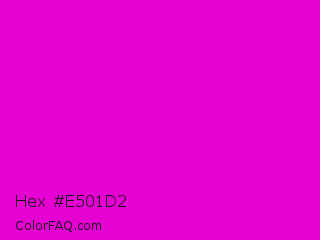 Hex #e501d2 Color is a normal magenta color and the nearest color is Deep Magenta #cc00cc. Hex code #e501d2 and RGB value is rgb(229,1,210). In RGB color space, this color is composed of 90% red, 0% green, 82% blue, In CMYK color space, this color is composed of 0% cyan, 100% magenta, 8% yellow , 10% black , In HSL color space, this color has a hue angle of 305° , 99% saturation and 45% lightness.