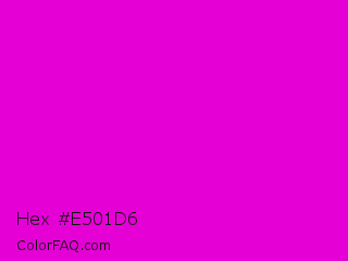 Hex #e501d6 Color is a normal magenta color and the nearest color is Deep Magenta #cc00cc. Hex code #e501d6 and RGB value is rgb(229,1,214). In RGB color space, this color is composed of 90% red, 0% green, 84% blue, In CMYK color space, this color is composed of 0% cyan, 100% magenta, 7% yellow , 10% black , In HSL color space, this color has a hue angle of 304° , 99% saturation and 45% lightness.