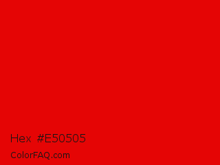 Hex #e50505 Color is a normal red color and the nearest color is KU Crimson #e8000d. Hex code #e50505 and RGB value is rgb(229,5,5). In RGB color space, this color is composed of 90% red, 2% green, 2% blue, In CMYK color space, this color is composed of 0% cyan, 98% magenta, 98% yellow , 10% black , In HSL color space, this color has a hue angle of 0° , 96% saturation and 46% lightness.