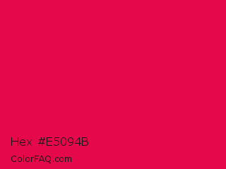 Hex #e5094b Color is a normal rose color and the nearest color is Red Ribbon #ed0a3f. Hex code #e5094b and RGB value is rgb(229,9,75). In RGB color space, this color is composed of 90% red, 4% green, 29% blue, In CMYK color space, this color is composed of 0% cyan, 96% magenta, 67% yellow , 10% black , In HSL color space, this color has a hue angle of 342° , 92% saturation and 47% lightness.