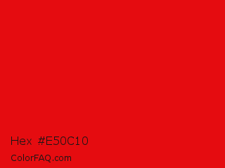 Hex #e50c10 Color is a normal red color and the nearest color is KU Crimson #e8000d. Hex code #e50c10 and RGB value is rgb(229,12,16). In RGB color space, this color is composed of 90% red, 5% green, 6% blue, In CMYK color space, this color is composed of 0% cyan, 95% magenta, 93% yellow , 10% black , In HSL color space, this color has a hue angle of 359° , 90% saturation and 47% lightness.