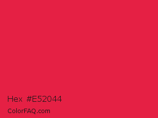 Hex #e52044 Color is a normal red color and the nearest color is Spanish Crimson #e51a4c. Hex code #e52044 and RGB value is rgb(229,32,68). In RGB color space, this color is composed of 90% red, 13% green, 27% blue, In CMYK color space, this color is composed of 0% cyan, 86% magenta, 70% yellow , 10% black , In HSL color space, this color has a hue angle of 349° , 79% saturation and 51% lightness.