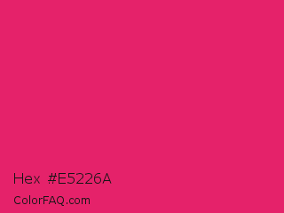 Hex #e5226a Color is a normal rose color and the nearest color is Razzmatazz #e3256b. Hex code #e5226a and RGB value is rgb(229,34,106). In RGB color space, this color is composed of 90% red, 13% green, 42% blue, In CMYK color space, this color is composed of 0% cyan, 85% magenta, 54% yellow , 10% black , In HSL color space, this color has a hue angle of 338° , 79% saturation and 52% lightness.