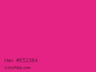 Hex #e52384 Color is a normal rose color and the nearest color is Barbie Pink #e0218a. Hex code #e52384 and RGB value is rgb(229,35,132). In RGB color space, this color is composed of 90% red, 14% green, 52% blue, In CMYK color space, this color is composed of 0% cyan, 85% magenta, 42% yellow , 10% black , In HSL color space, this color has a hue angle of 330° , 79% saturation and 52% lightness.