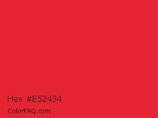 Hex #e52434 Color is a normal red color and the nearest color is Alizarin Crimson #e32636. Hex code #e52434 and RGB value is rgb(229,36,52). In RGB color space, this color is composed of 90% red, 14% green, 20% blue, In CMYK color space, this color is composed of 0% cyan, 84% magenta, 77% yellow , 10% black , In HSL color space, this color has a hue angle of 355° , 79% saturation and 52% lightness.