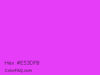 Hex #e53df8 Color is a light magenta color and the nearest color is Purple Pizzazz #fe4eda. Hex code #e53df8 and RGB value is rgb(229,61,248). In RGB color space, this color is composed of 90% red, 24% green, 97% blue, In CMYK color space, this color is composed of 8% cyan, 75% magenta, 0% yellow , 3% black , In HSL color space, this color has a hue angle of 294° , 93% saturation and 61% lightness.
