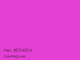 Hex #e540d4 Color is a normal magenta color and the nearest color is Purple Pizzazz #fe4eda. Hex code #e540d4 and RGB value is rgb(229,64,212). In RGB color space, this color is composed of 90% red, 25% green, 83% blue, In CMYK color space, this color is composed of 0% cyan, 72% magenta, 7% yellow , 10% black , In HSL color space, this color has a hue angle of 306° , 76% saturation and 57% lightness.