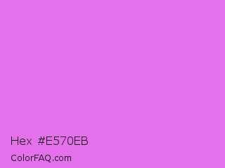 Hex #e570eb Color is a light magenta color and the nearest color is Lavender Magenta #ee82ee. Hex code #e570eb and RGB value is rgb(229,112,235). In RGB color space, this color is composed of 90% red, 44% green, 92% blue, In CMYK color space, this color is composed of 3% cyan, 52% magenta, 0% yellow , 8% black , In HSL color space, this color has a hue angle of 297° , 75% saturation and 68% lightness.